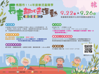 最新/即時 桃園市114年度樂活重陽季-長青運動系列活動 邀請長者一起動起來,在運動與健康中迎接重陽佳節 桃園動起來,銀髮更精彩!桃園市政府特別推出「114年度樂活重陽季-長青運動系列活動」,將於 9月22日至26日在桃園國民運動中心與中壢國民運動中心熱鬧登場。活動以「銀髮桃樂園」為主題,專為55歲以上的 […]
